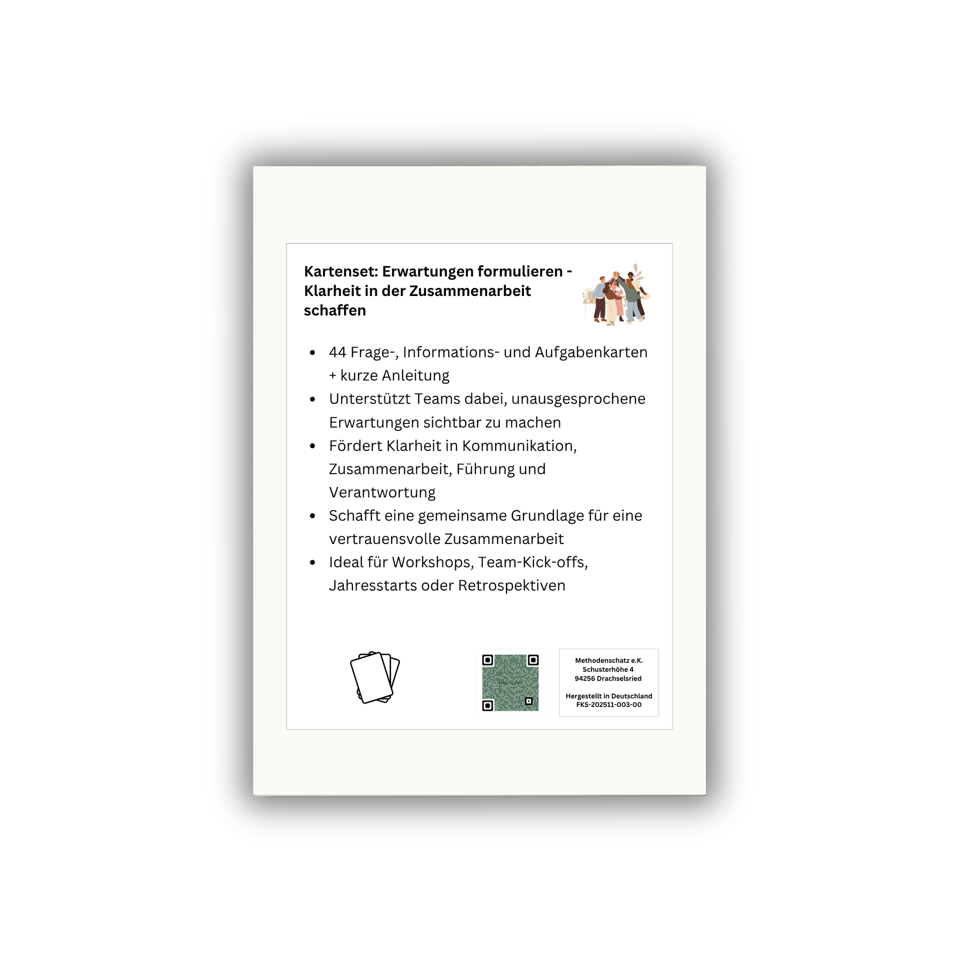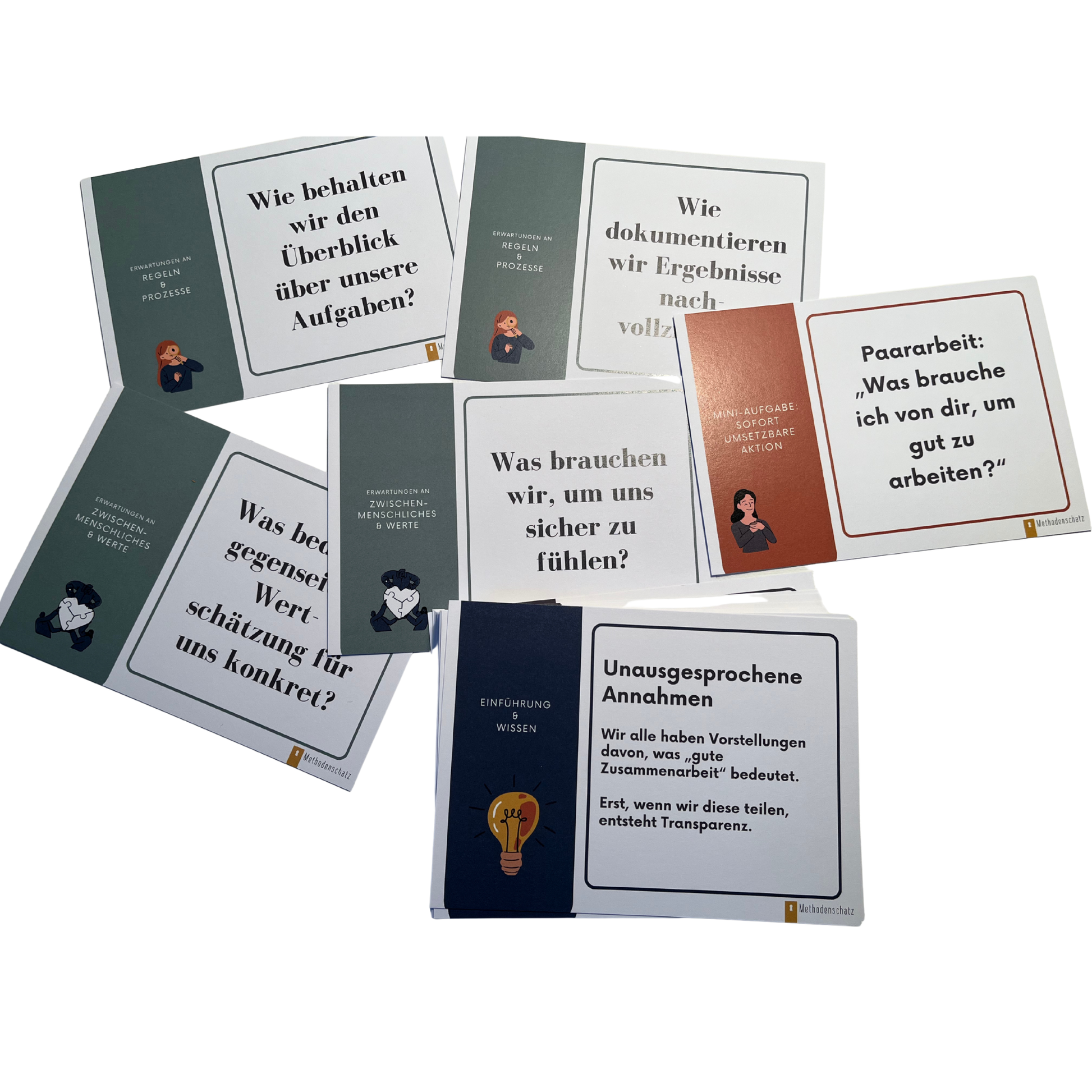 Dieses Set hilft Teams, unausgesprochene Erwartungen sichtbar zu machen und klare Grundlage für Zusammenarbeit, Verantwortung und Kommunikation zu schaffen. Ideal, um Missverständnisse zu vermeiden und Rollen zu klären.