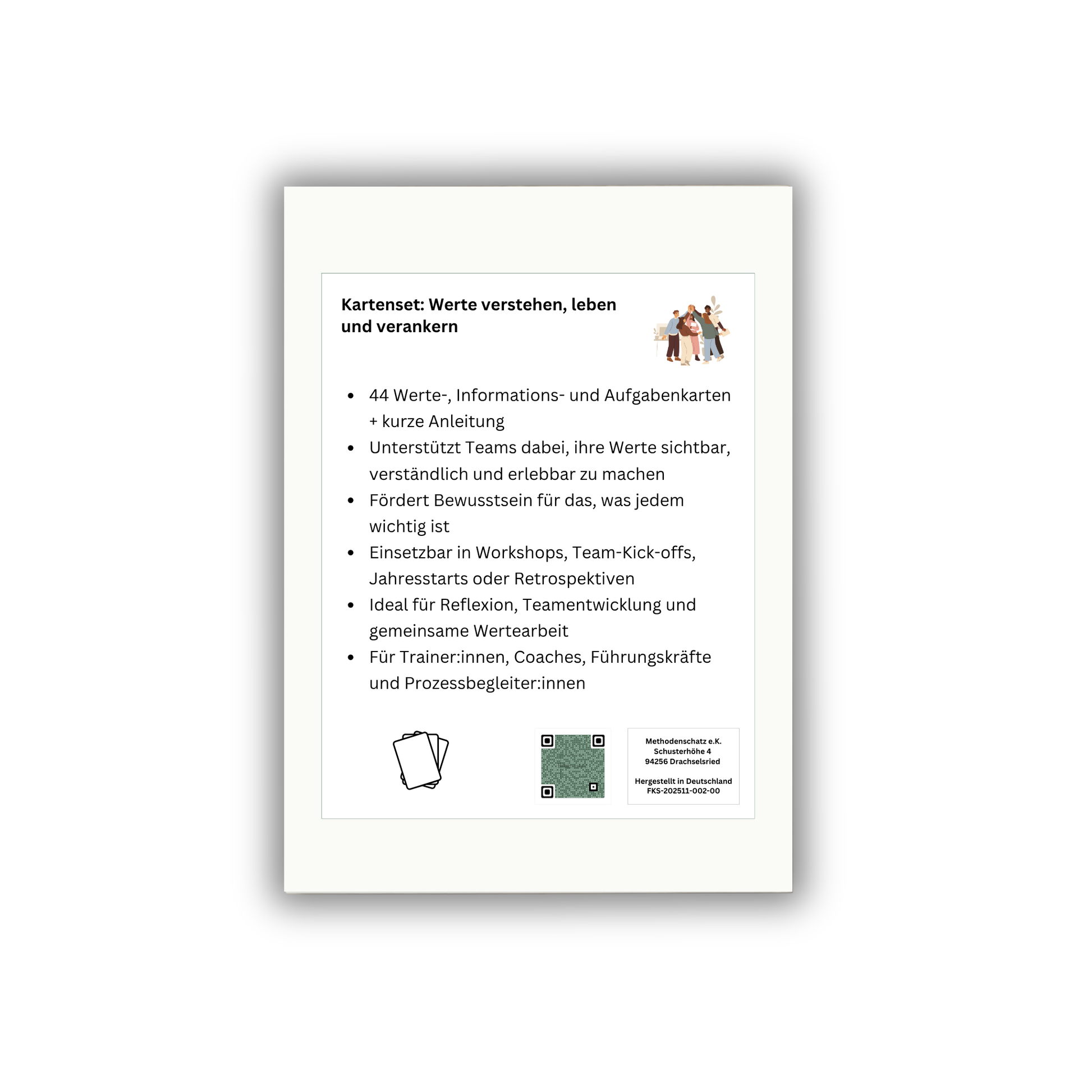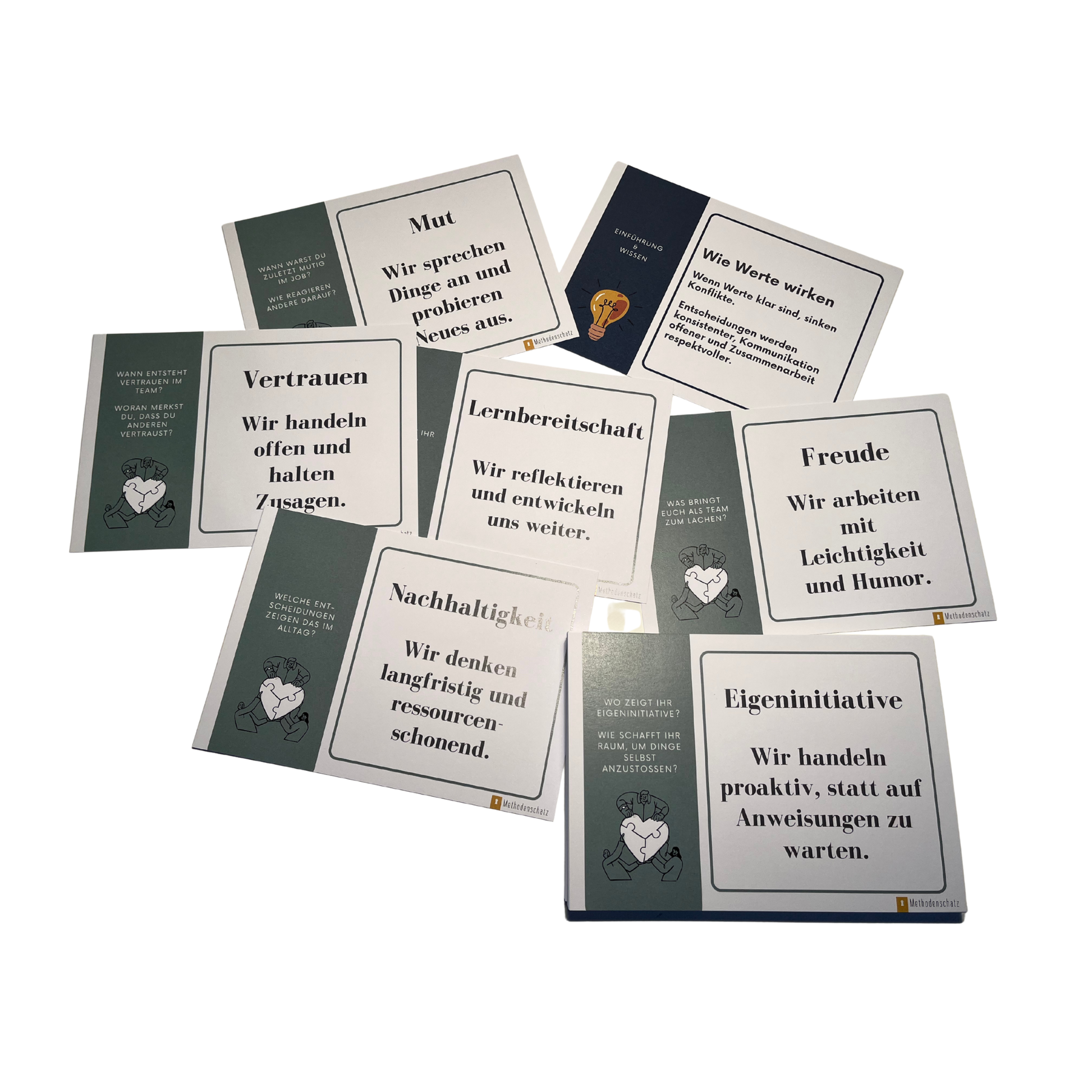 Dieses Kartenset unterstützt Teams dabei, ihre gemeinsamen Werte sichtbar, verständlich und erlebbar zu machen. Es schafft Klarheit darüber, was jedem wichtig ist, fördert Teamkultur und stärkt die Basis für vertrauensvolle Zusammenarbeit.